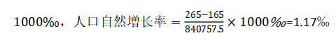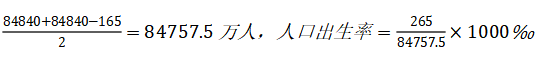 例2:某地2021年出生人口265萬人,死亡人口100萬人,2021年末84840萬人,比去年增加165萬人,求人口自然增長率?