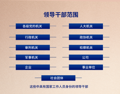 領(lǐng)導干部是指在各級黨的機關(guān)、人大機關(guān)、行政機關(guān)、政協(xié)機關(guān)、審判機關(guān)、檢察機關(guān)、軍事機關(guān)以及公司、企業(yè)、事業(yè)單位、社會團體中具有國家工作人員身份的領(lǐng)導干部。