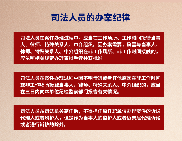 第三條 各級司法機關(guān)應(yīng)當建立公正、高效、廉潔的辦案機制,確保司法人員與當事人、律師、特殊關(guān)系人、中介組織無不正當接觸、交往行為,切實防止利益輸送,保障案件當事人的合法利益,維護國家法律統(tǒng)一正確實施,維護社會公平正義。