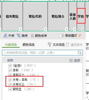 那如何從職位表中篩選出??茖W歷可報考的職位呢?