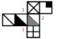 此時我們看到,題目每個選項都是要兩個三角形和×這三個面相連的關(guān)系,根據(jù)剛剛標的點,是1連接了這三個面,所以應該在黑三角圖中位置方向的右上角,灰色三角圖中位置的左上角,×面的任意位置,根據(jù)這三個位置鎖定答案D。