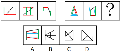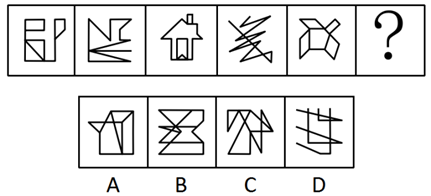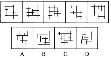 元素組成不同,且無(wú)明顯的屬性規(guī)律,考慮數(shù)量規(guī)律。觀察發(fā)現(xiàn)題干中圖形均由橫豎線組成,優(yōu)先考慮直線數(shù),整體觀察無(wú)規(guī)律,細(xì)化觀察圖形的豎線的數(shù)量依次遞增,分別為2、3、4、5、6,因此,?處應(yīng)該填入有7條豎線的圖形,A、B、C、D四項(xiàng)豎線的數(shù)目依次為7、4、5、6,只有A項(xiàng)符合。
