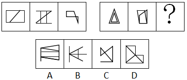 圖形元素組成不同,且無(wú)明顯屬性規(guī)律,考慮數(shù)量規(guī)律。題干中圖形都是多邊形,由多條直線構(gòu)成,考慮直線數(shù),但整體數(shù)直線沒有規(guī)律,觀察發(fā)現(xiàn)題干圖形出現(xiàn)成對(duì)的平行線,故考慮平行線。如下圖所示,第一組圖中,每幅圖均有2組平行線,第二組圖前兩幅圖均有3組平行線,故問號(hào)處圖形要滿足有3組平行線,只有A選項(xiàng)符合。