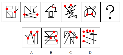 元素組成不同,考慮屬性規(guī)律和數(shù)量規(guī)律。觀察發(fā)現(xiàn),圖2、圖4、D項(xiàng)均為多端點(diǎn)圖形,圖5為圓相交的變形,可考慮筆畫數(shù)。題干圖形奇點(diǎn)數(shù)均為2,是一筆畫,故?處圖形應(yīng)為一筆畫圖形。A項(xiàng)、B項(xiàng)均有4個(gè)奇點(diǎn),是兩筆畫圖形,C項(xiàng)有2個(gè)奇點(diǎn),是一筆畫圖形,D項(xiàng)有6個(gè)奇點(diǎn),是三筆畫圖形。