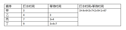 【解析】要使4人打水的時間與等待的時間和最短,讓等待時間最短即可,因為打水的時間是固定的,所以在只有一個水龍頭的情況下,肯定是打水時間最短的人先打,打水時間最長的后打,所以,4個人的打水順序是甲、乙、丙、丁。