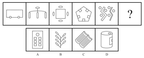 答案:B【解析】:分析題干,我們發(fā)現(xiàn)所給出的圖形元素組成不同,無明顯屬性規(guī)律,這時我們可以考慮數(shù)量規(guī)律。例如第一個圖形是由“1個矩形”和“2個圓”組成;第二個圖形是由“3個長吊墜”和“1個橢圓+傘狀線條”組成;第三個圖形是由“4個橢圓”和“1個矩形”組成;第四個圖形由“5個小方形”和“1個五邊形”組成....這時,大家應該已經(jīng)發(fā)現(xiàn)圖形中的規(guī)律了吧!題干每個圖形中均有形狀相同的小圖形,且數(shù)量依次為2、3、4、5、6,?,那么問號處圖形應該含有7個形狀相同的小圖形。A項6個,B項7個,C項2個,D項沒有形狀相同的小圖形,所以只有B項符合。故正確答案為B。