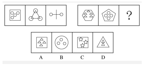 第二組圖形中的黑圓數(shù)量分別為1、2,那么問號處的第三個圖形,應該是有3個黑圓,排除C選項;第一個圖形的白圓數(shù)量等于后兩個圖形中白圓數(shù)量之和,由此應選擇含有3個黑圓、2個白圓的圖形,所以這道題選擇D選項。