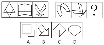 這時我們來看一下第二組的圖形:在第二組中,圖1、2、3外部直線數(shù)為6、5、?,問號處圖形外部輪廓直線數(shù)應為4,排除B、D項。繼續(xù)觀察,第二組中同種元素的個數(shù)分別為5、4、?問號處圖形同種元素個數(shù)應該為3,只有C項符合。故正確答案為C。