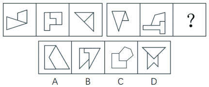 答案:D【解析】觀察圖形發(fā)現(xiàn),每幅圖都由兩個圖形組成,且分開看兩圖形均為軸對稱圖形。如下圖所示,將所有圖形的對稱軸分別畫出來后會發(fā)現(xiàn),第一組圖的對稱軸分別是平行(形成夾角為0°)、相交形成45°夾角、相交形成90°夾角;第二組圖也分別是平行(形成夾角為0°)、相交形成45°夾角,所以?處應選擇一個兩圖對稱軸相交形成90°夾角的圖形,只有D項符合。故正確答案為D。