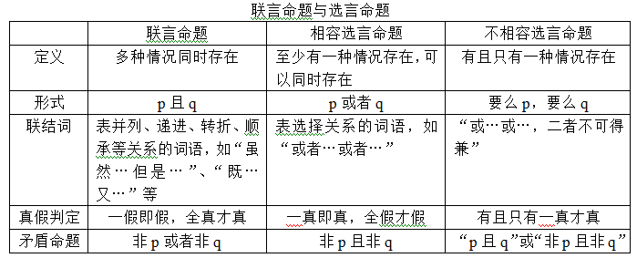 復(fù)言命題是由兩個(gè)或多個(gè)單句通過(guò)聯(lián)結(jié)詞聯(lián)結(jié)而成的命題。根據(jù)邏輯聯(lián)結(jié)詞的不同,國(guó)考中常見(jiàn)的復(fù)言命題主要有聯(lián)言命題、選言命題和假言命題三種,其中選言命題根據(jù)是否能夠同時(shí)存在又可分為相容選言命題和不相容選言命題兩種,假言命題根據(jù)條件和結(jié)論的關(guān)系也可分為充分條件假言命題、必要條件假言命題和充分必要條件假言命題三種。
