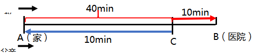 【例題1】趙騎車去醫(yī)院看病,父親在發(fā)現(xiàn)小趙忘帶醫(yī)??〞r以60千米/小時的速度開車追上小趙,把醫(yī)??ń唤o他并立即返回。小趙拿到醫(yī)??ê笥烛T了10分鐘到達(dá)醫(yī)院,小趙父親也同時到家。假如小趙從家到醫(yī)院共用時50分鐘,則小趙的速度為多少千米/小時?(假定小趙及其父親全程都勻速行駛,忽略父子二人交接卡的時間)
