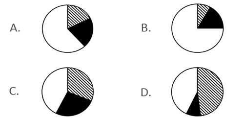 對于餅狀圖讀數(shù),要遵循12點原則,即以12點鐘方向為起點,沿著順時針方向依次對圖進行閱讀取數(shù),然后根據(jù)具體要求作答;對于圖形只給出簡單區(qū)塊劃分,并沒有給出具體數(shù)值,且與比重、比例相關(guān)題目結(jié)合時,我們先看大小,再看比例。先看圖形分塊最大部分占比是否接近1/2、1/4、3/4等特殊數(shù)值,通過特殊數(shù)值點排除部分選項,再看其他量的比例關(guān)系繼而求得答案。