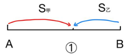 然后兩人從①點(diǎn)繼續(xù)行走,到達(dá)終點(diǎn)后立即返回,在②點(diǎn)第二次相遇:此時(shí)我們發(fā)現(xiàn),甲乙所走的路程和為兩倍的AB,也就是2S,因?yàn)閮扇怂俣榷疾蛔?,則此段時(shí)間為2t,同理甲乙各自走的路程為2S甲和2S乙