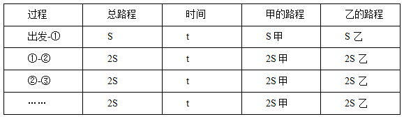 由此類推,兩人從②點(diǎn)繼續(xù)行走到③點(diǎn)相遇的話,甲乙所走的路程和為依舊為兩倍的AB,也就是2S,因?yàn)閮扇怂俣纫琅f都不變,則此段時(shí)間仍為2t,同理甲乙各自走的路程仍為2S甲和2S乙