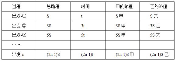 繼續(xù)推導(dǎo)可得,從第三次相遇點(diǎn)到第四次相遇點(diǎn)、從第四次相遇點(diǎn)到第五次相遇點(diǎn)……,各種量皆滿足此規(guī)律,列表表示: