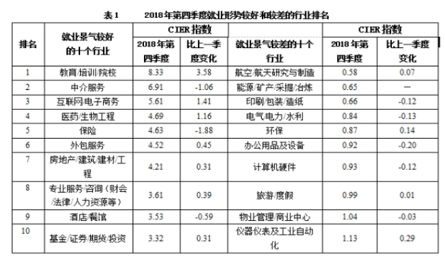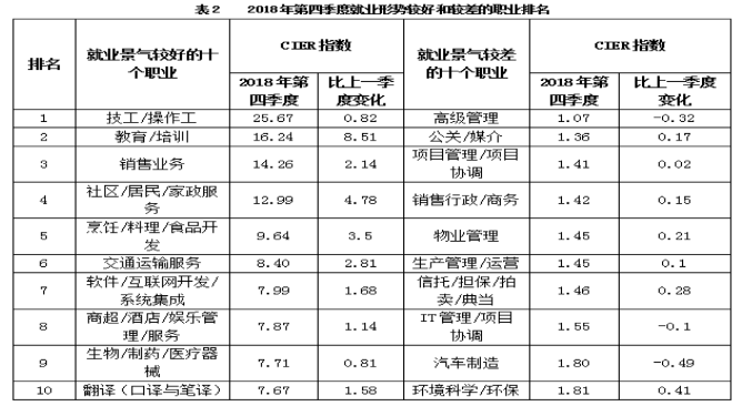 CIER指數(shù)用來反映就業(yè)市場景氣程度,其計算方法是:CIER指數(shù)=市場招聘需求人數(shù)/市場求職申請人數(shù)。根據(jù)有關(guān)機(jī)構(gòu)發(fā)布的數(shù)據(jù),2018年第一季度CIER指數(shù)為1.91,第二季度為1.88,第三季度為1.97,第四季度為2.38。2018年第三季度,招聘需求人數(shù)環(huán)比下降20.79%,求職申請人數(shù)環(huán)比下降24.37%;第四季度,招聘需求人數(shù)環(huán)比增加25.42%,求職申請人數(shù)環(huán)比增加3.9%。