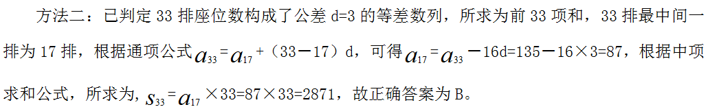 【答案】B。【解析】方法一:由題干可知,共有33排座位,后一排比前一排多3個,即從第二排開始,后一排座位數(shù)減前一排座位數(shù)為定值3,說明33排座位數(shù)構成了公差d=3的等差數(shù)列,已知