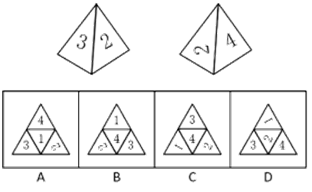 37、如圖所示是從兩個(gè)不同角度觀察到的同一個(gè)正四面體的外表面,將該四面體展開,可能得到的圖形是( )。