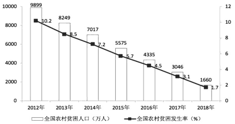黨的十八大以來,脫貧工作取得巨大成效,全國農(nóng)村貧困人口大幅減少。截至2018年末,全國農(nóng)村貧困人口從2012年末的9899萬人減少至1660萬人;農(nóng)村貧困發(fā)生率從2012年的10.2%下降至1.7%,累計(jì)下降8.5個(gè)百分點(diǎn)。