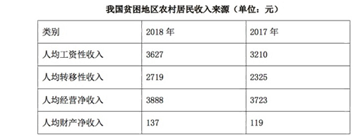 2018年,貧困地區(qū)農(nóng)村居民人均可支配收入10371元,扣除價(jià)格因素,實(shí)際增長(zhǎng)8.3%,實(shí)際增速高出全國農(nóng)村居民人均可支配收入實(shí)際增速1.7個(gè)百分點(diǎn),圓滿完成增長(zhǎng)幅度高于全國增速的年度目標(biāo)任務(wù)。