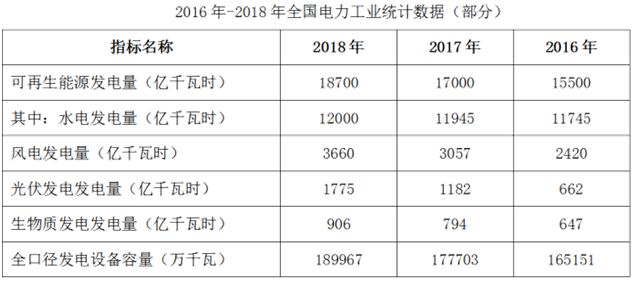 2018年,我國可再生能源發(fā)電量達(dá)1.87萬億千瓦時(shí),同比增長(zhǎng)約1700億千瓦時(shí);可再生能源發(fā)電量占全年發(fā)電總量比重為26.7%,同比上升0.2個(gè)百分點(diǎn)。