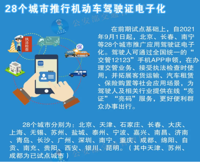 北京等28個(gè)城市推行機(jī)動(dòng)車駕駛證電子化。在前期試點(diǎn)基礎(chǔ)上,北京、長(zhǎng)春、南寧等28個(gè)城市推廣應(yīng)用機(jī)動(dòng)車駕駛證電子化。通過全國(guó)統(tǒng)一的“交管12123”APP發(fā)放電子駕駛證,電子駕駛證在全國(guó)范圍內(nèi)有效,辦理交管業(yè)務(wù)、接受執(zhí)法檢查時(shí)出示使用,并拓展客貨運(yùn)輸、汽車租賃、保險(xiǎn)購(gòu)置等社會(huì)應(yīng)用場(chǎng)景,為駕駛?cè)颂峁┰诰€“亮證”“亮碼”服務(wù),進(jìn)一步簡(jiǎn)化辦事手續(xù)資料,提升證件使用便捷度,更好便利群眾辦事出行。此后,將陸續(xù)在全國(guó)范圍內(nèi)分階段實(shí)施。
