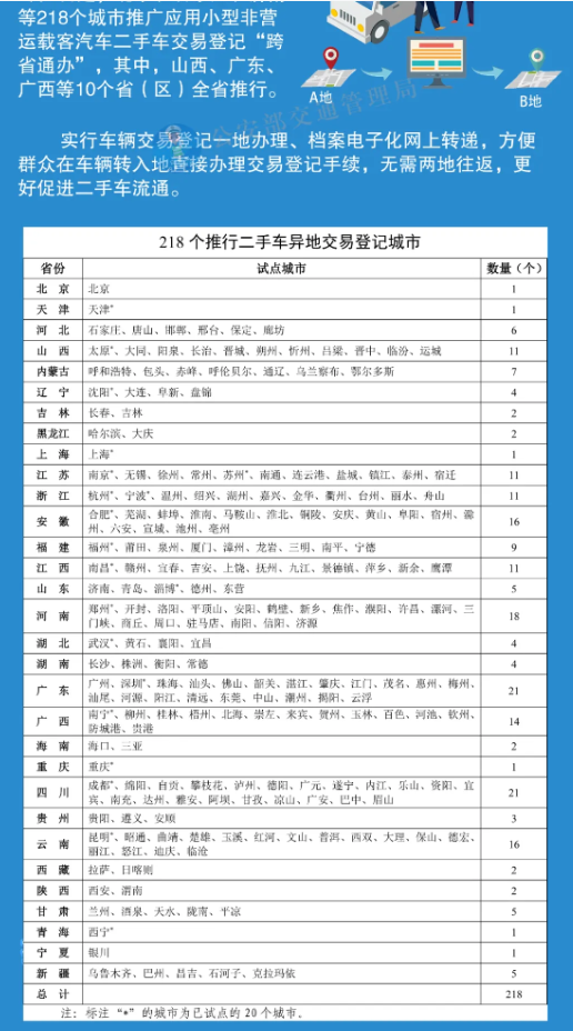 石家莊等218個(gè)城市推行二手車異地交易登記。經(jīng)商商務(wù)部、國(guó)家稅務(wù)總局,在天津、太原、沈陽、上海等20個(gè)城市試點(diǎn)推行小型非營(yíng)運(yùn)載客汽車二手車交易登記“跨省通辦”基礎(chǔ)上,北京、石家莊、濟(jì)南等218個(gè)城市推廣應(yīng)用,其中,山西、廣東、廣西等10個(gè)?。▍^(qū))全省推行。對(duì)二手車需要在異地交易的,實(shí)行二手車交易登記一地辦理、檔案電子化網(wǎng)上轉(zhuǎn)遞,實(shí)現(xiàn)二手車全國(guó)范圍內(nèi)跨省跨市異地交易登記,無需兩地往返,更好促進(jìn)二手車流通。