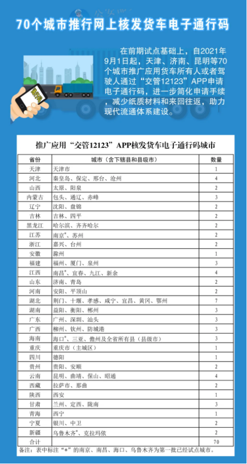 天津等70個(gè)城市推行網(wǎng)上核發(fā)貨車電子通行碼。在南京、南昌、海口、烏魯木齊4個(gè)城市試點(diǎn)貨車所有人或者駕駛?cè)送ㄟ^“交管12123”APP申請(qǐng)電子通行碼基礎(chǔ)上,天津、濟(jì)南、昆明等70個(gè)城市推廣應(yīng)用“交管12123”APP核發(fā)貨車電子通行碼,進(jìn)一步簡(jiǎn)化申請(qǐng)手續(xù),減少紙質(zhì)材料和來回往返,助力現(xiàn)代流通體系建設(shè)。