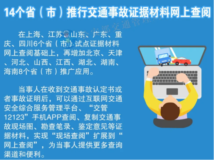 河北等14個(gè)?。ㄊ校┩菩薪煌ㄊ鹿首C據(jù)材料網(wǎng)上查閱。在上海、江蘇、山東、廣東、重慶、四川6個(gè)?。ㄊ校┰圏c(diǎn)證據(jù)材料網(wǎng)上查閱基礎(chǔ)上,再增加北京、天津、河北、山西、江西、湖北、湖南、海南8個(gè)省(市)推廣應(yīng)用。當(dāng)事人在收到交通事故認(rèn)定書或者事故證明后,可以通過互聯(lián)網(wǎng)交通安全綜合服務(wù)管理平臺(tái)、“交管12123”APP查閱、復(fù)制交通事故現(xiàn)場(chǎng)圖、勘查筆錄、鑒定意見等證據(jù)材料,實(shí)現(xiàn)“現(xiàn)場(chǎng)查閱”擴(kuò)展到“網(wǎng)上查閱”,為當(dāng)事人提供更多查詢渠道和便利。