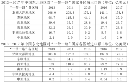 自2013年習(xí)近平主席提出“一帶一路”的戰(zhàn)略構(gòu)想以來,中國東北地區(qū)積極參與其中,取得了豐碩成果,2013年至2017年中國東北地區(qū)對“一帶一路”國家各區(qū)域進(jìn)出口額如下: