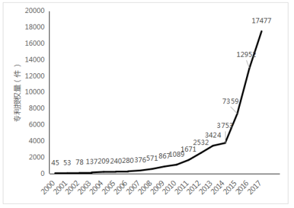 圖1 2000-2017年中國人工智能專利授權(quán)情況(單位:件)