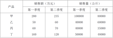 某水產(chǎn)公司共銷售甲、乙、丙、丁四種魚類產(chǎn)品。其在兩個季度的銷售額和銷售量情況如下: