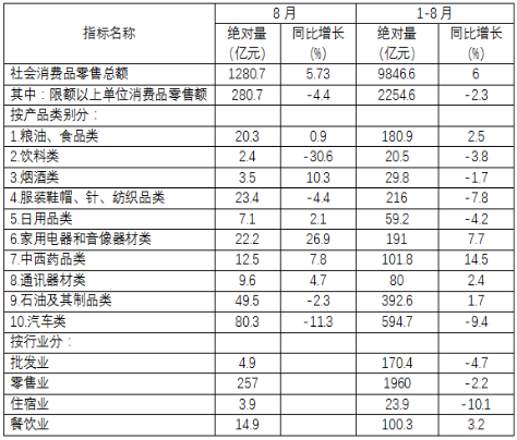 2019年1-8月,遼寧省社會消費(fèi)品零售總額9846.6億元,比上年同期增長6.0%,增速回落1.6個百分點(diǎn)。限額以上單位消費(fèi)品零售額實現(xiàn)2254.6億元,同比下降,增速回落6.5個百分點(diǎn)。