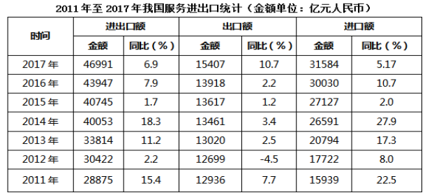 111.2011年至2017年,我國服務進出口逆差最大的年份是:( )
