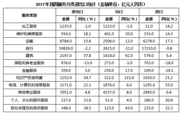 C.2017年我國服務進出口中,其他商業(yè)服務進出口實現(xiàn)的順差最多