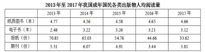 A.2013年至2017年我國成年國民人均電子書閱讀量逐年上升