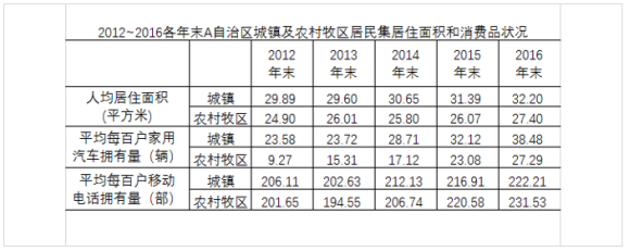 2016年末A自治區(qū)城鎮(zhèn)人均居住面積達(dá)32.20平方米,比1978年末增長(zhǎng)了5.5倍;農(nóng)村牧區(qū)人均居住面積達(dá)27.40平方米,比1985年末增長(zhǎng)103%。2016年末A自治區(qū)城鎮(zhèn)居民家庭每百戶擁有家用汽車(chē)38.48輛、家用電腦62臺(tái)、移動(dòng)電話222.21部;農(nóng)牧民家庭每百戶擁有家用汽車(chē)27.29輛、家用電腦23臺(tái)、移動(dòng)電話231.53部。
