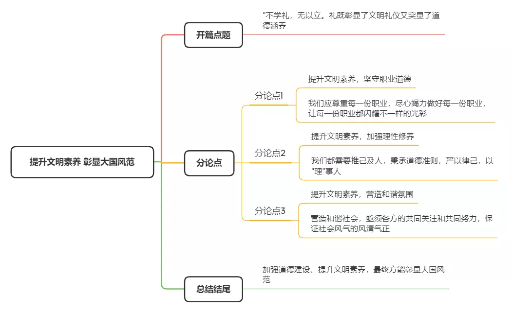 隨著我國改革開放步伐的加快,我國的社會主要矛盾已經(jīng)發(fā)生了改變,但是,人們的精神文明卻與之不相匹配,這無疑引發(fā)了我們的深思。提升文明素養(yǎng),離不開個人對于職業(yè)道德的踐行,離不開個人對于理性原則的把握,更離不開每個人對于和諧的崇尚。加強道德建設(shè)、提升文明素養(yǎng),最終方能彰顯大國風范?!?/span>結(jié)尾使用小排比句式回扣主題】