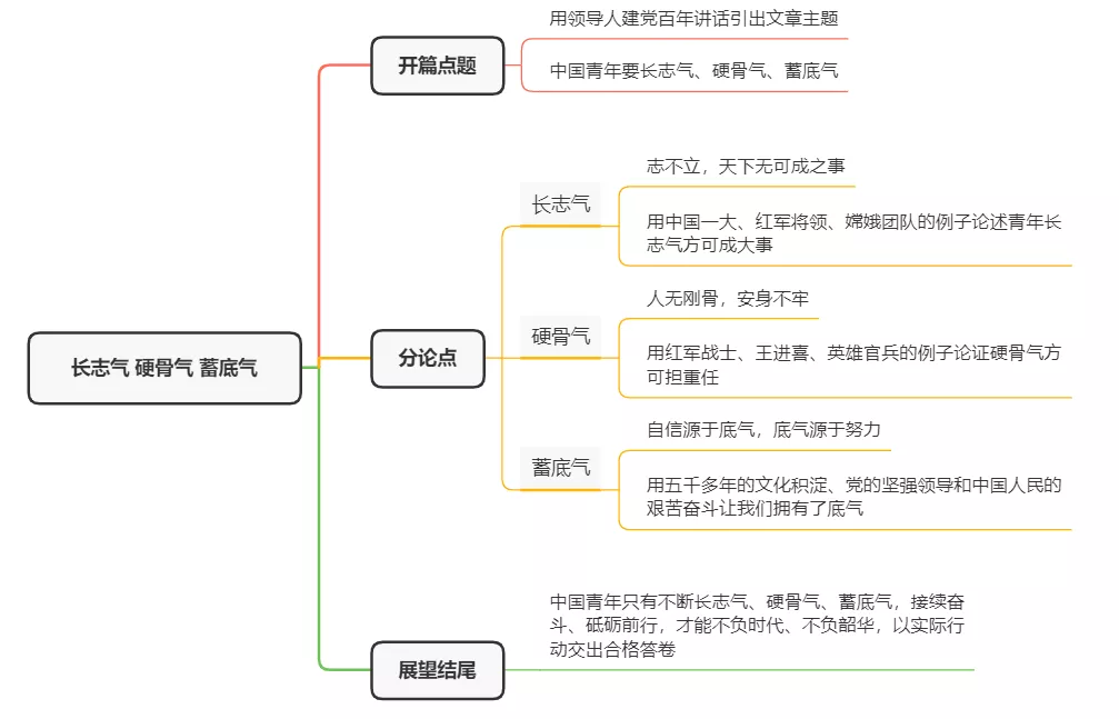 志不立,天下無可成之事。我們要堅定理想信念,做有志氣的新時代青年。長志氣,就要不斷筑牢信仰之基、補足精神之鈣、把穩(wěn)思想之舵,以堅定的理想信念砥礪對黨的赤誠忠心。中共一大代表平均年齡28歲,長征途中紅軍將領(lǐng)平均年齡不足25歲,嫦娥團隊、神舟團隊平均年齡33歲,北斗團隊平均年齡35歲……一代代充滿救國報國強國志氣的優(yōu)秀青年,把青春和熱血融入祖國江河,展示了磅礴力量。(青年事例,建議積累)新時代的中國青年要心懷“國之大者”,把立大志、明大德、成大才、擔大任作為人生追求,在感悟真理力量中堅定志氣,在學思踐悟中堅定理想信念,在奮發(fā)有為中踐行初心使命。【分論點1:志不立,天下無可成之事;本段用直接說理+事例論證的方式論述長志氣方可成大事】