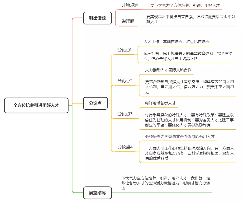 人才工作,基礎(chǔ)在培養(yǎng),難點也在培養(yǎng)。這些年來,黨中央堅持高端引領(lǐng)、整體推進,加快構(gòu)建科學的人才培養(yǎng)體系,著力培養(yǎng)更多適應(yīng)高質(zhì)量發(fā)展、高水平科技自立自強的各類人才,成果豐碩。應(yīng)當看到,培養(yǎng)人才是國家和民族長遠發(fā)展的大計,當今世界人才的競爭首先是人才培養(yǎng)的競爭。我們必須增強憂患意識,更加重視人才自主培養(yǎng),加快建立人才資源競爭優(yōu)勢。要走好人才自主培養(yǎng)之路,高校特別是“雙一流”大學要發(fā)揮培養(yǎng)基礎(chǔ)研究人才主力軍作用,全方位謀劃基礎(chǔ)學科人才培養(yǎng),建設(shè)一批基礎(chǔ)學科培養(yǎng)基地,培養(yǎng)高水平復(fù)合型人才;要制定實施基礎(chǔ)研究人才專項,長期穩(wěn)定支持一批在自然科學領(lǐng)域取得突出成績且具有明顯創(chuàng)新潛力的青年人才;要培養(yǎng)造就大批哲學家、社會科學家、文學藝術(shù)家等各方面人才。習近平總書記深刻指出:“我國擁有世界上規(guī)模最大的高等教育體系,有各項事業(yè)發(fā)展的廣闊舞臺,完全能夠源源不斷培養(yǎng)造就大批優(yōu)秀人才,完全能夠培養(yǎng)出大師。我們要有這樣的決心、這樣的自信。”【分論點1,人才工作,基礎(chǔ)在培養(yǎng),難點也在培養(yǎng)。這一段結(jié)構(gòu)跟平時咱們常見的分論點寫法略有不同,用的是中心句+說理+對策+說理總結(jié)的結(jié)構(gòu)。我國擁有世界上規(guī)模最大的高等教育體系,完全有決心、信心走好人才自主培養(yǎng)之路】