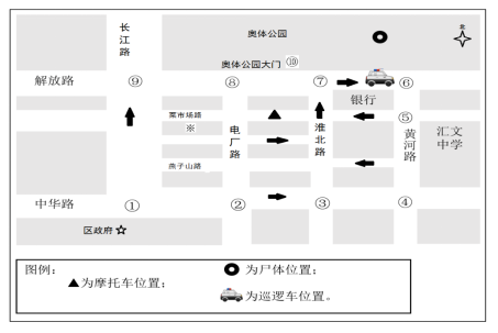 93.某日晚9時許,奧體公園(注 奧體公園只有一個大門進出)發(fā)生一起搶劫殺人案 家住菜市場路1號(圖中※標識的位置)的許女士及其丈夫在奧體公園散步時,遭遇到一個持槍搶劫犯的襲擊,許女士被槍擊身亡(圖中黑圈O標識的尸體位置),其丈夫重傷,他們被搶手機兩部,金項鏈、金耳環(huán)各一條,挎包一個。公安機關(guān)立即展開偵査,應(yīng)査看監(jiān)控錄像的先后順序是(圖片中的順序號即為視頻監(jiān)控)( )(單選)