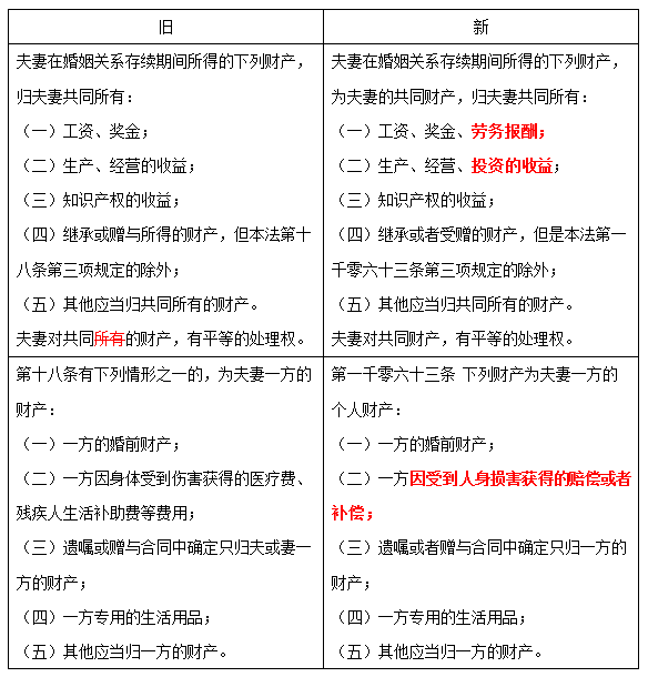 從上述內(nèi)容中不難看出民法典對于婚姻中夫妻財產(chǎn)部分改動還是比較大的。主要是在共同財產(chǎn)中增加了勞務報酬以及投資的收益以及擴大了一人身體傷害獲得賠償、補償金的范圍。其中最主要的就是共同財產(chǎn)中的: