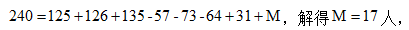某單位共有240名員工,其中訂閱A期刊的有125人,訂閱B期刊的有126人,訂閱C期刊的有135人,訂閱A、B期刊的有57人,訂閱A、C期刊的有73人,訂閱B、C期刊的有64人,訂閱3種期刊的有31人。問(wèn):沒(méi)有訂閱這三種期刊中任何一種的有多少人?( )