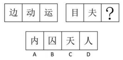 【答案】B【解析】第一組圖,前兩個(gè)字求異,去掉相同元素“力”,組合得到第三個(gè)字。第二組圖,去掉相同元素“二”,組合得到“囚”,故,正確答案為B。