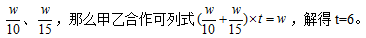 方法二:已知甲、乙?guī)煾祮为?dú)施工分別需要10天和15天,可設(shè)工作總量w為他們時間的最小公倍數(shù)為30,則甲、乙的工作效率分別為3和2,那么他們合作完工需要30÷(3+2)=6天。
