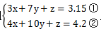 【例題1】甲、乙、丙三種貨物,如果購買甲3件、乙7件、丙1件需花3.15元;如果購買甲4件、乙10件、丙1件需花4.2元,那么購買甲、乙、丙各一件需要花多少元錢?( )