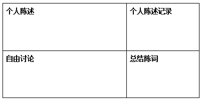 當然,考慮到記錄內容的多寡,可以調整四個片區(qū)的大小,比如個人陳述提綱和自由討論內容較多,可以選擇將左邊上下兩個區(qū)域面積擴大。