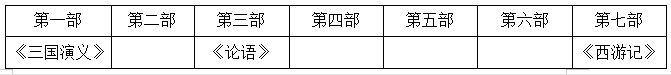 根據(jù)題干條件可以發(fā)現(xiàn)關(guān)于《道德經(jīng)》描述信息次數(shù)最多,可從道德經(jīng)入手,由(1)可知《三國(guó)演義》與《道德經(jīng)》之間還有另外兩部著作,因此第四部閱讀《道德經(jīng)》。再由《三國(guó)演義》和《道德經(jīng)》之間的著作不是《詩(shī)經(jīng)》,并結(jié)合條件(4)可知,第五部閱讀《詩(shī)經(jīng)》。而《水滸傳》和《紅樓夢(mèng)》無(wú)順序信息描述,二者具體位置無(wú)法確定。最終表格如下: