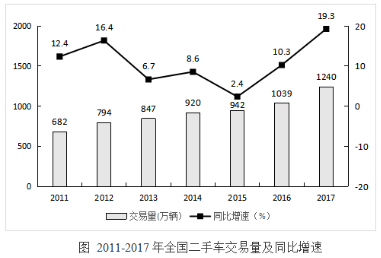 問題:2011-2017年,全國二手車交易量同比增量低于80萬輛的年份有幾個( )?