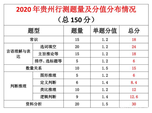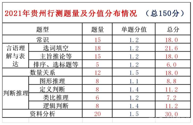 貴州省考行測分值總和為150分,言語理解與判斷推理兩塊占比最大。2021年貴州省考數(shù)量關(guān)系較2020年增加了2道。